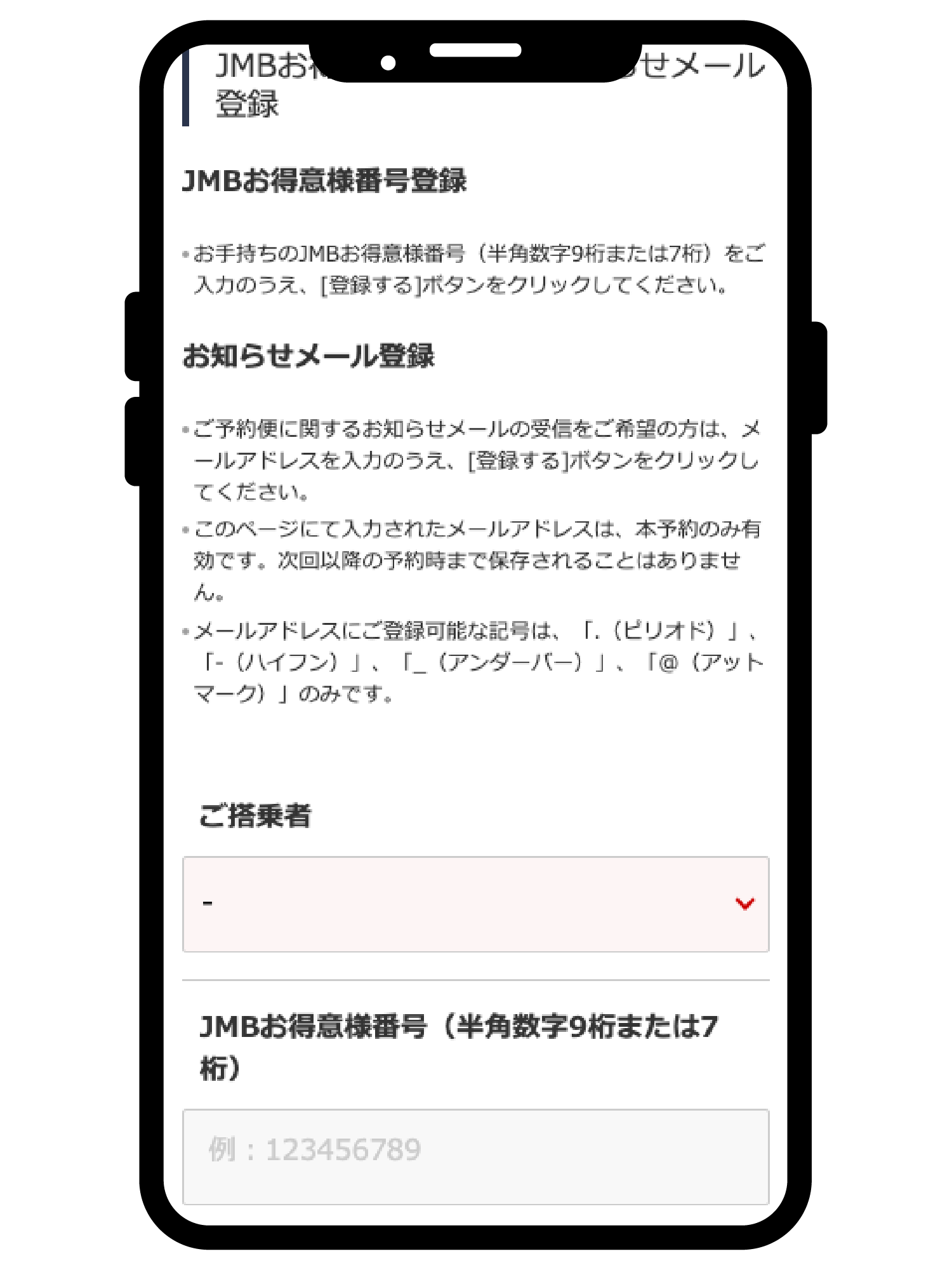 ④フライト情報画面の下の方に「JMBお得意様番号登録/お知らせメール登録」の項目があるので、プルダウンで搭乗者を選択して、JMBお得意様番号を入力して「登録する」ボタン をタップすると登録されます。