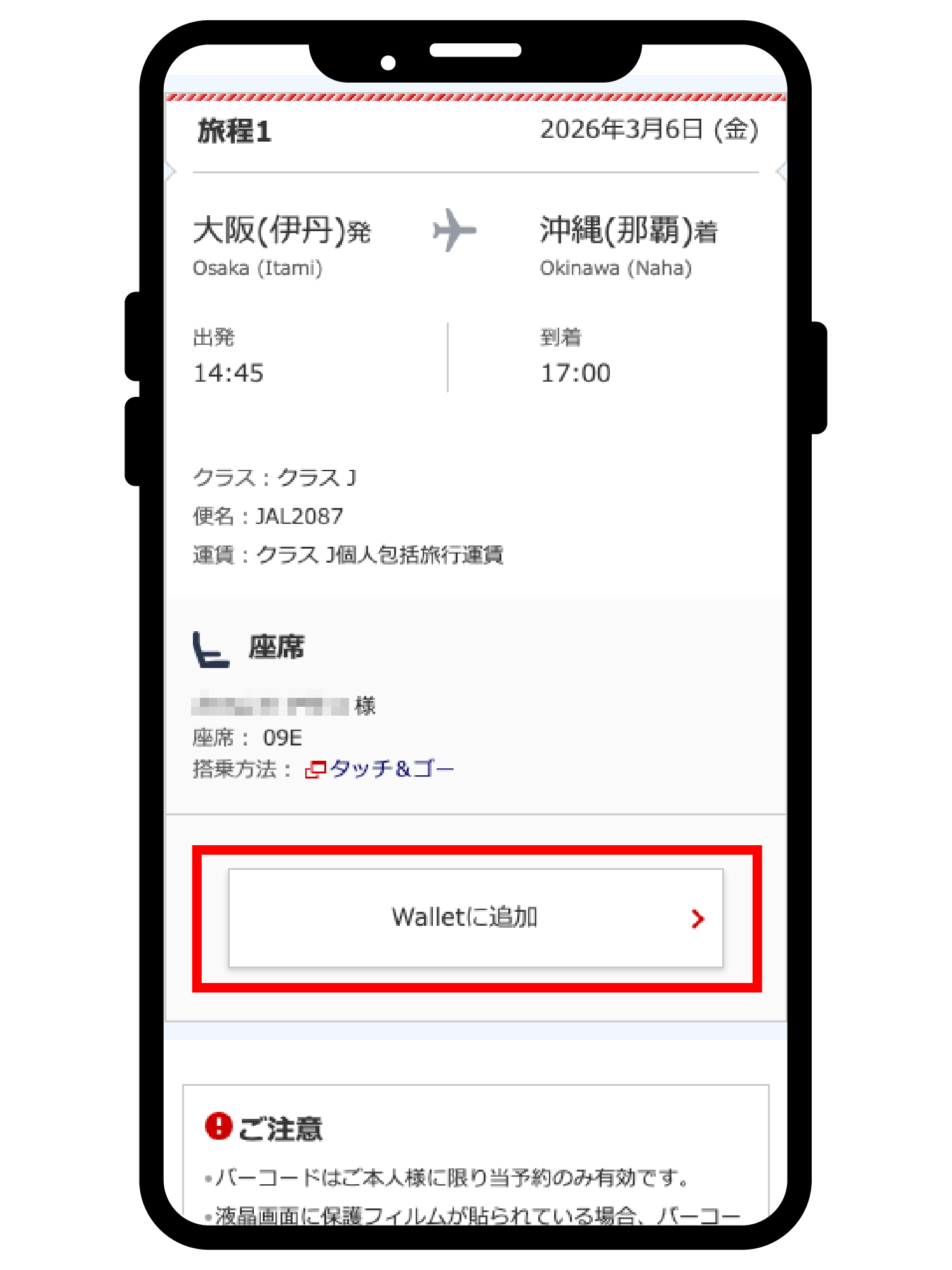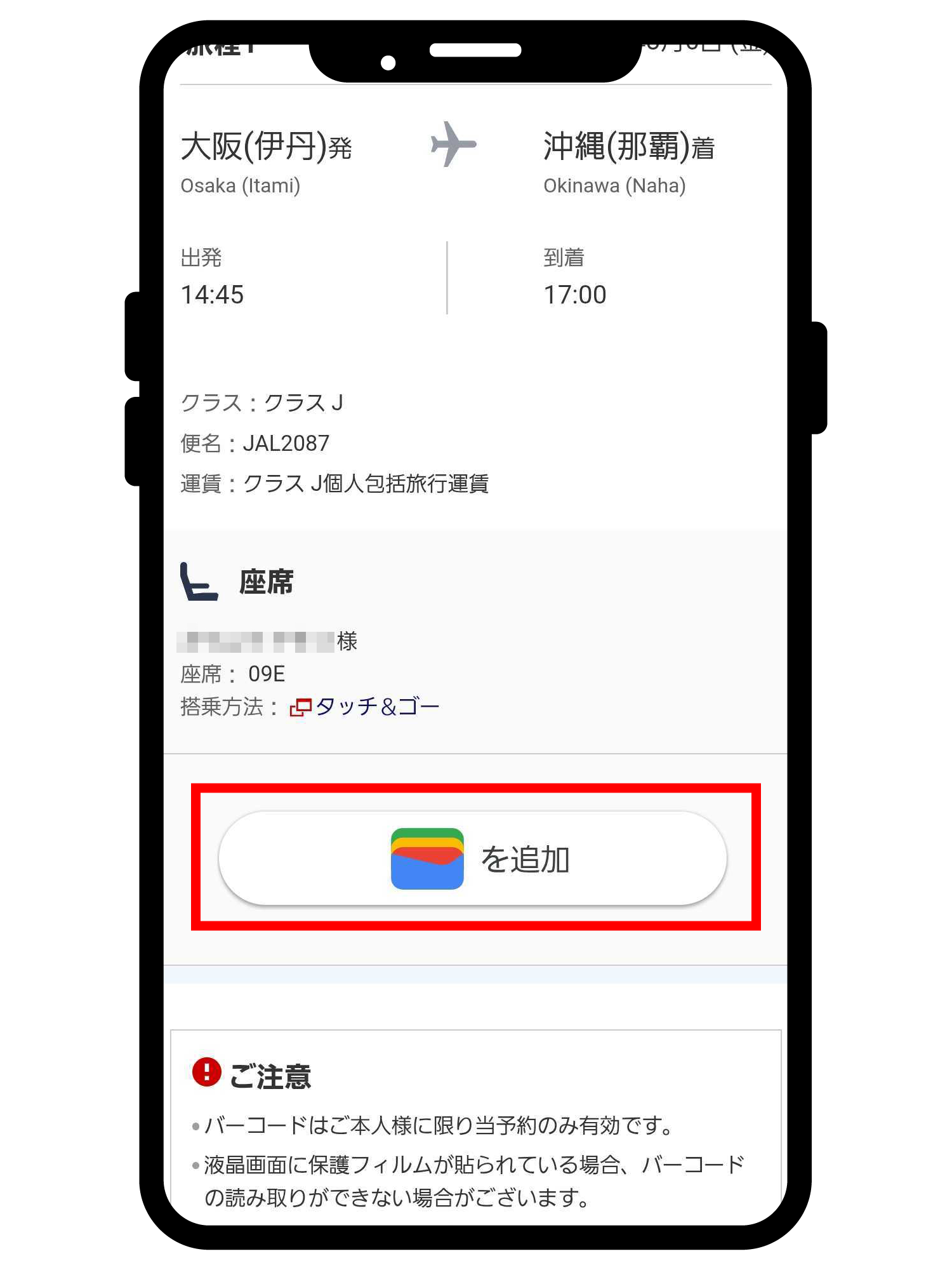 ⑤モバイル搭乗券画面にある「Walletに追加」または「Google ウォレットに追加する」ボタンをタップして表示される画面の右上にある「追加」ボタンをタップするとアプリに保存されます。