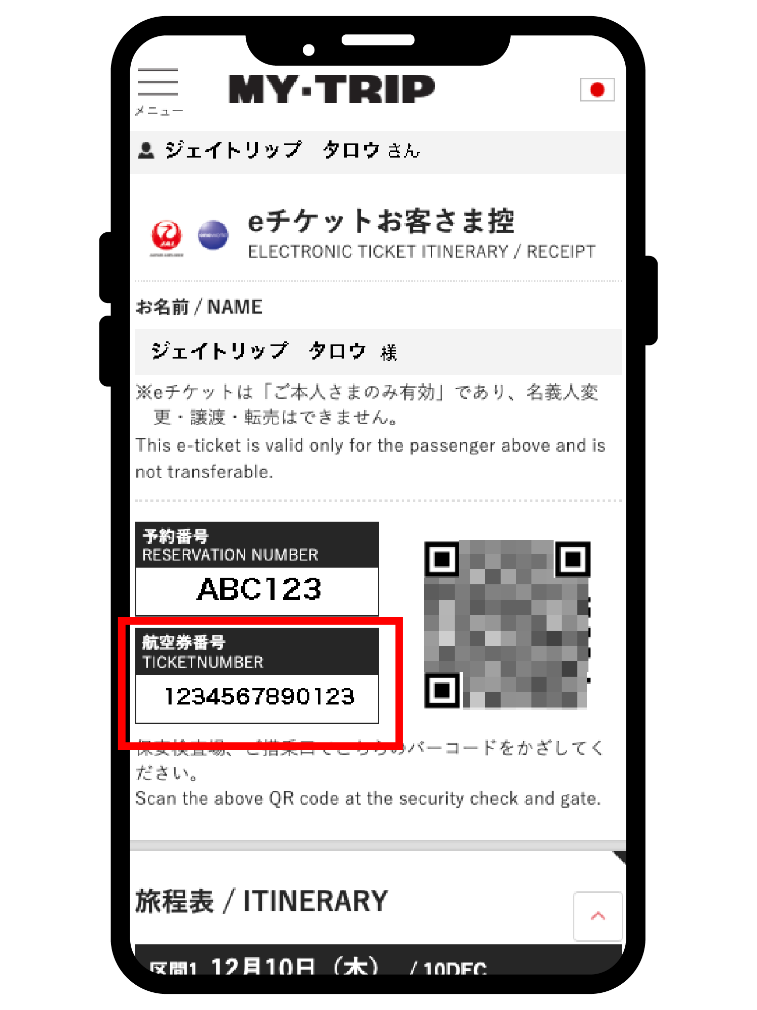 ※航空券番号はMY-TRIP(マイページ)のeチケットお客様控を表示すると確認できます。
